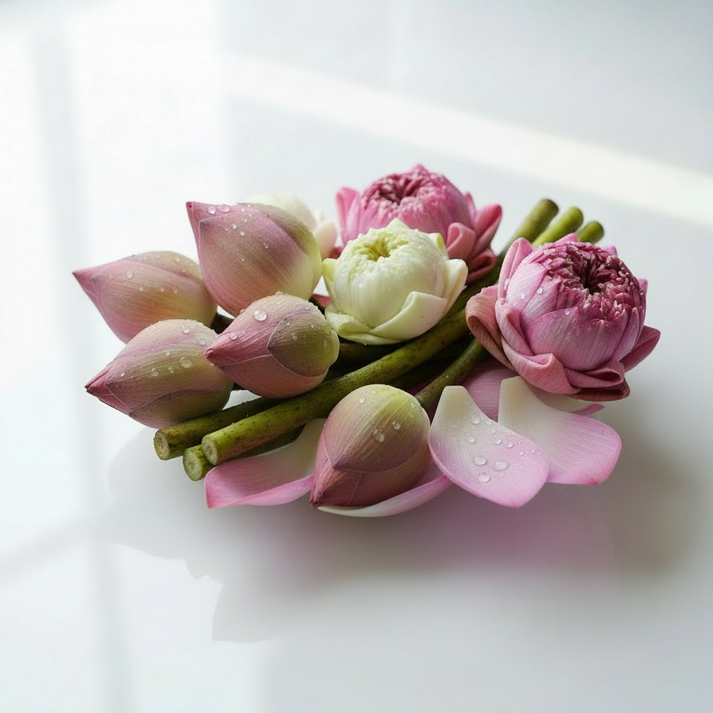 A curated tribute to the rare botanicals that define our formulations. Each creation is enriched with additional supportive ingredients that complete the ritual of care.